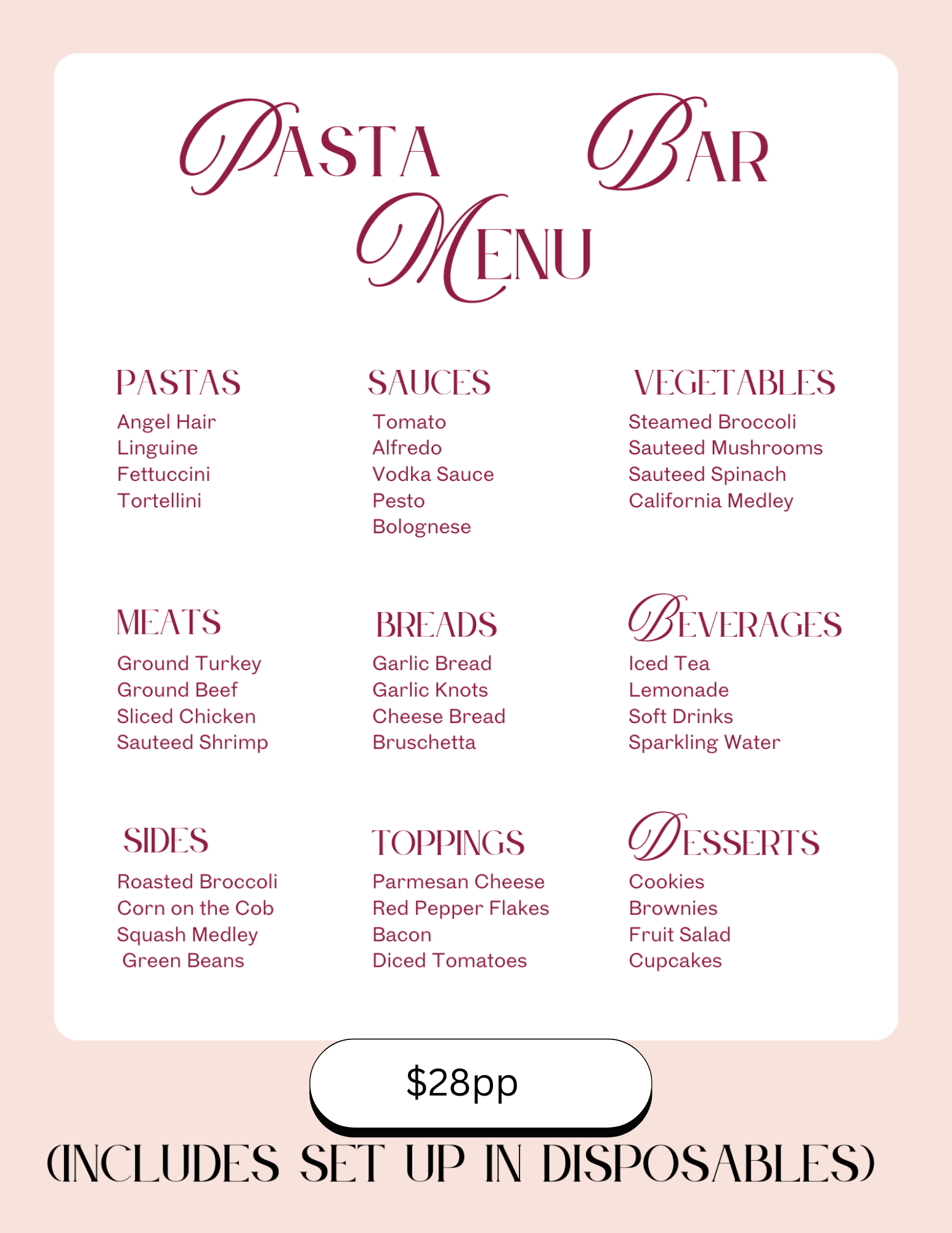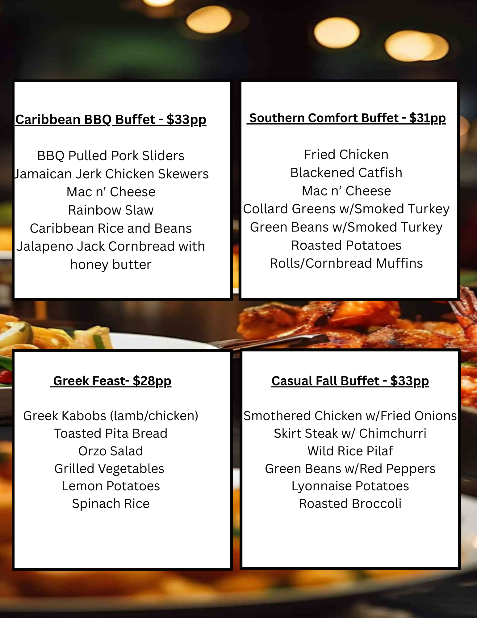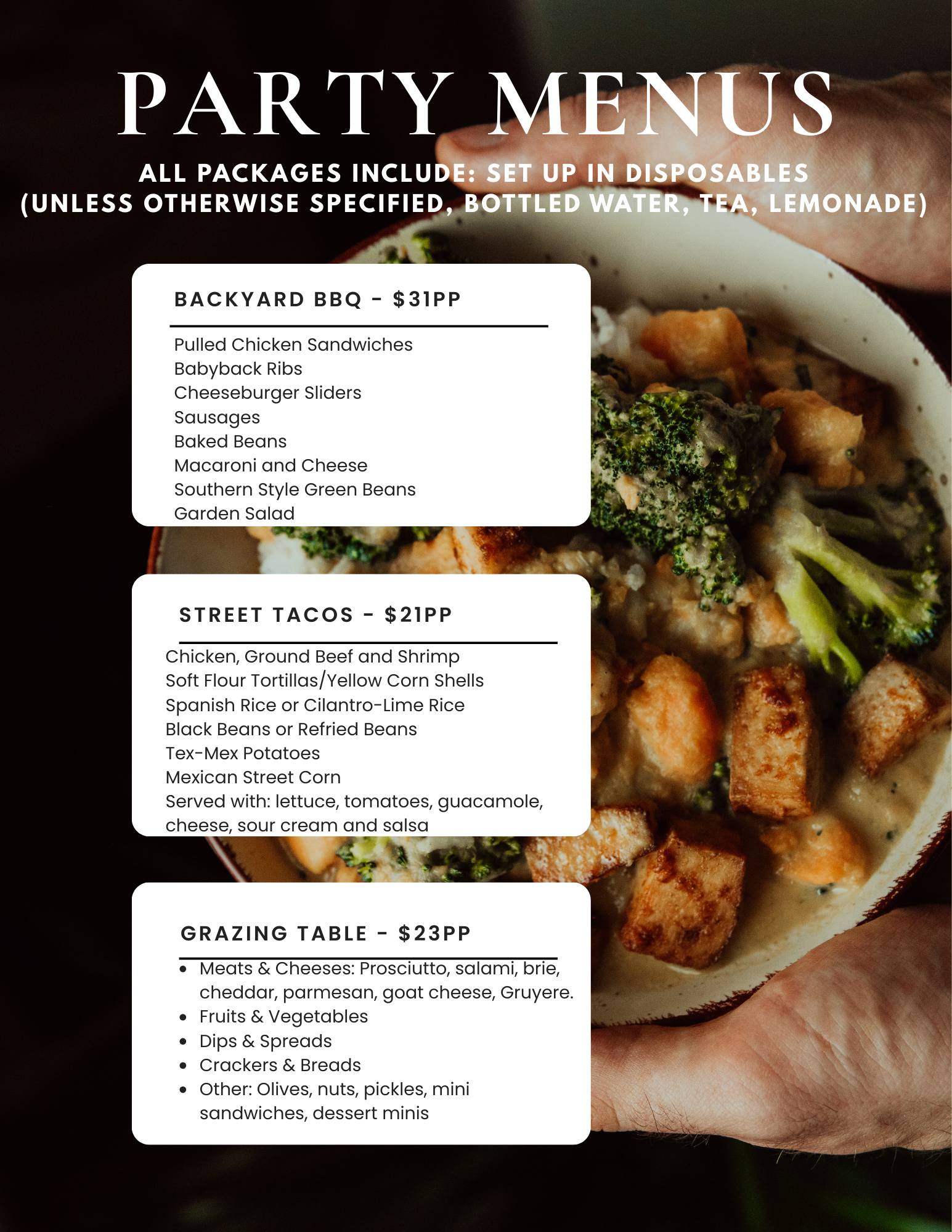 Choose from our signature options—light, medium, or heavy menus—or let us create a custom menu that fits your taste, theme, and budget. From savory appetizers to sweet finishes, each bite is prepared fresh and served with the warmth and hospitality you can only find down South.